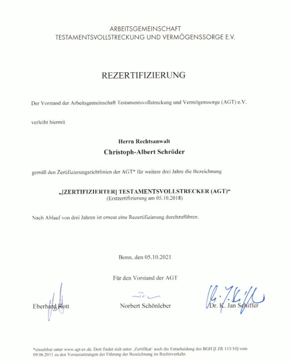 Rechtsanwalt Schröder wurde durch die Arbeitsgemeinschaft Testamentsvollstreckung und Vermögenssorge e.V. in Bonn für weitere drei Jahre rezertifiziert, nachdem er nachgewiesen hatte, dass er sich regelmäßig fortgebildet und praktische Fähigkeiten hat.